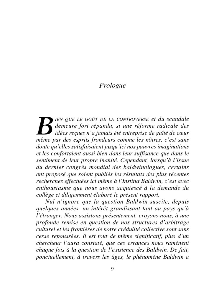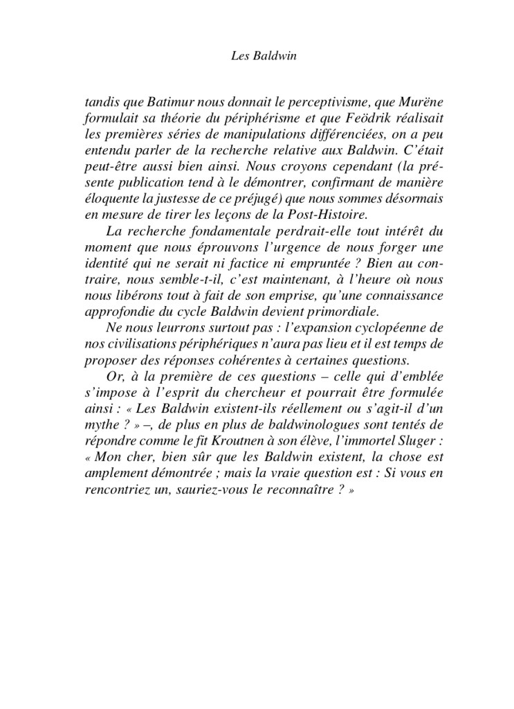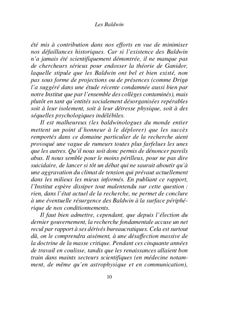 Quelques êtres errent sur une terre dévastée. Que s’est-il passé? Un mégatsunami? Une nouvelle glaciation? Une pandémie? Une sécheresse? Les écureuils et les pigeons servent de monnaie d’échange, la découverte d’un éclat de verre, d’un bout de métal suffit à provoquer l’expérience mystique. Qu’ils soient fonctionnaire ou prostituée, guérisseur ou contorsionniste, survivre est une occupation à temps plein pour les Baldwin. Grâce aux récitantes, l’épopée de ces créatures étranges est restituée dans toute son âpreté, pour la plus grande joie des baldwinologues qui n’ont de cesse de traquer la vérité. Les Baldwin ont-ils réellement existé ou s’agit-il d’un mythe? Force nous est d’admettre que leur monde offre de troublantes ressemblances avec le nôtre.