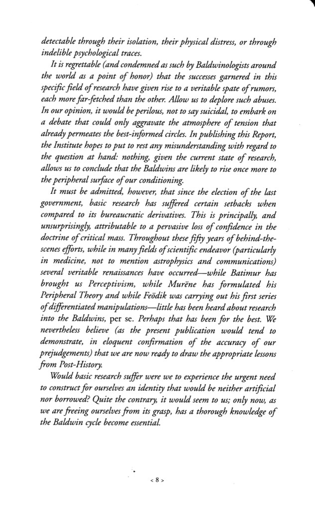 In the post-apocalyptic future, 50 years after the last government of turbo-liberals and its president-for-life have been elected, a group of researchers convenes a Congress to address the curious cultural phenomenon of the Baldwins, whose stories have been gathered and archived by the chroniclers. This novel of fragments represents contemporary prose at its most daring and experimental.